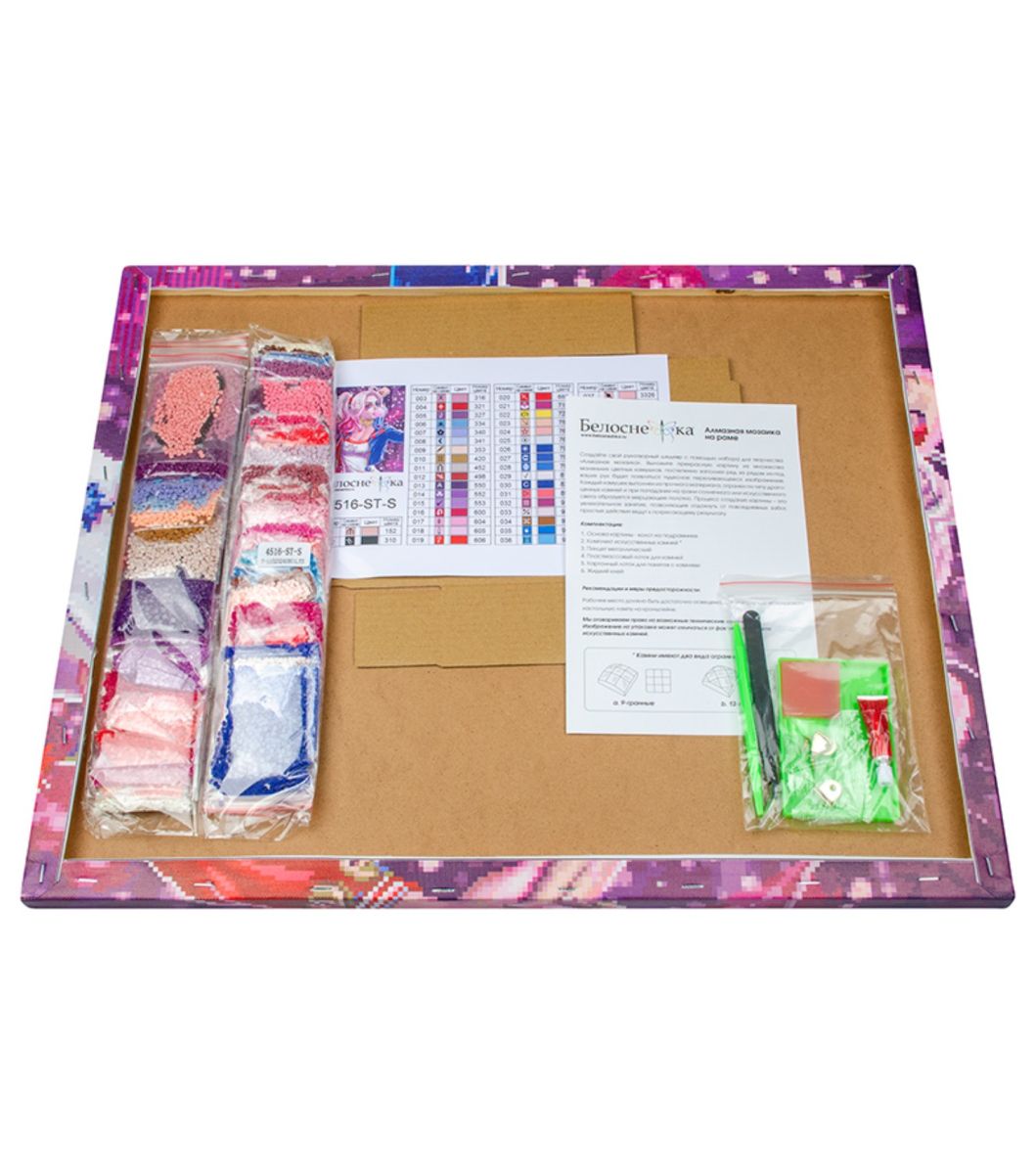 В набор алмазной мозаики 40*50 см. от «Белоснежка» входит холст, закреплённый на деревянном подрамнике. На холст нанесена цветная схема с контрастными условными обозначениями. Поверхность покрыта высококачественным клеевым слоем, закрытым защитной плёнкой в целях предотвращения высыхания. Определитесь, как вам удобнее выкладывать картину – с помощью пинцета или стилуса – и можно творить! В комплекте разноцветные блестящие камни из эпоксидной смолы с огранкой 2.5*2.5 мм. Готовая картина будет переливаться блеском при попадании на неё солнечного света и впечатлит как детей, так и взрослых.