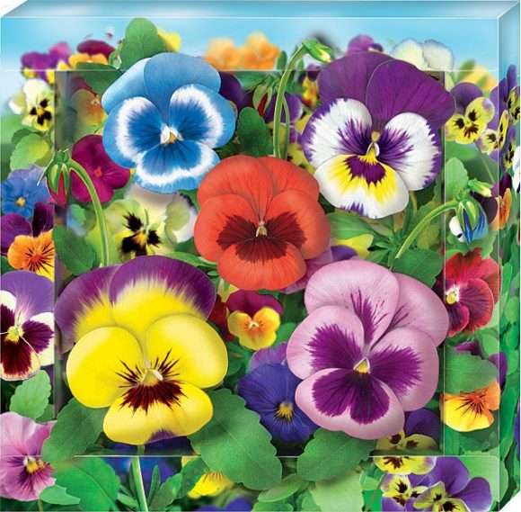 Анютины глазки – крупные фиалки самых  причудливых оттенков: от разноцветных и ярких, до нежных, пастельных. Анютины глазки символизируют раздумье. На языке цветов они означают: "Все мои помыслы о Вас". Этот цветок всегда особенно любили в Англии и посылали друг другу в Валентинов день, когда чувства можно раскрыть полностью после долгого застенчивого молчания, – анютины глазки ещё называют "сердечным успокоением", "сердечной радостью". Эту картину детям старше 10-ти лет и взрослым будет делать несложно, – нужно вырезать детали, аккуратно загнуть края лепестков, наклеить лепестки на метки в серединках будущих цветков, а затем наклеить цветы и листья на фон картины, – получится красочная, радостная картина из ярких цветов! Готовая глубокая рамка входит в набор!