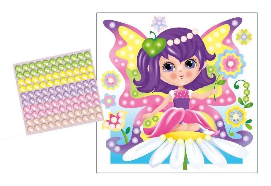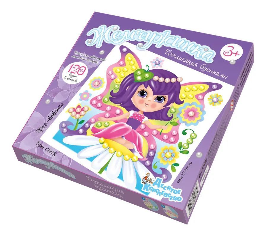 На качественной картонной основе с изображением феи-бабочки отмечены места для бусин, ребенку необходимо аккуратно наклеить бусины нужного цвета на соответствующие точки.