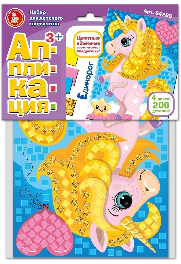 Самоклеящаяся аппликация «Единорог» (4 цв., 200 эл.). Состав набора: картонная основа с напечатанным цветным рисунком (18 х 25 см), самоклеящиеся квадратики четырёх цветов (жёлтый, золотой, розовый, голубой) – 200 шт. (1 квадратик – 7 х 7 мм). Материал: картон, вспененный этиленвинилацетат (EVA). Для детей от 3 лет. Работа над аппликацией способствует улучшению мелкой моторики рук, гибкости пальчиков и оттачиванию щипкового захвата.