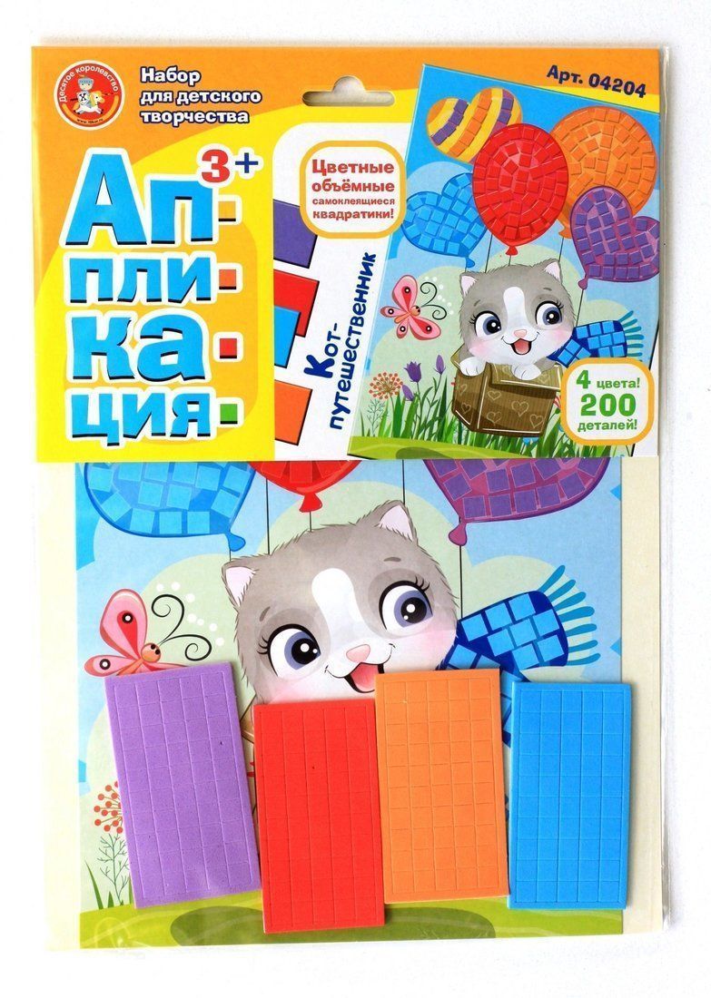 Самоклеящаяся аппликация «Кот-путешественник» (4 цв., 200 эл.). Состав набора: картонная основа с напечатанным цветным рисунком (18 х 25 см), самоклеящиеся квадратики четырёх цветов (оранжевый, красный, голубой, сиреневый) – 200 шт. (1 квадратик – 7 х 7 мм). Материал: картон, вспененный этиленвинилацетат (EVA). Для детей от 3 лет. Работа над аппликацией способствует улучшению мелкой моторики рук, гибкости пальчиков и оттачиванию щипкового захвата.