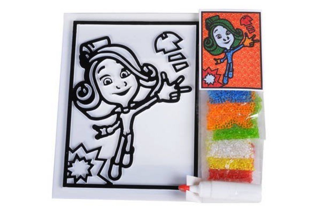 «Насыпь-наклей» – серия наборов-аппликаций. С помощью клея и цветных гранул ребёнок сможет собственными руками создать красочную объёмную открытку, а потом с гордостью показать и даже подарить её своим близким. Основа открытки – белая, рисунок обрисован чёрными выпуклыми линиями. Между выпуклыми линиями имеются отсеки различной формы. Каждый отсек нужно поочередно обработать клеем ПВА и поместить на него цветные гранулы нужного цвета, руководствуясь инструкцией. Старательно следуя инструкции, ребёнок в результате получает изображение, которое может украсить интерьер комнаты или стать оригинальным подарком.