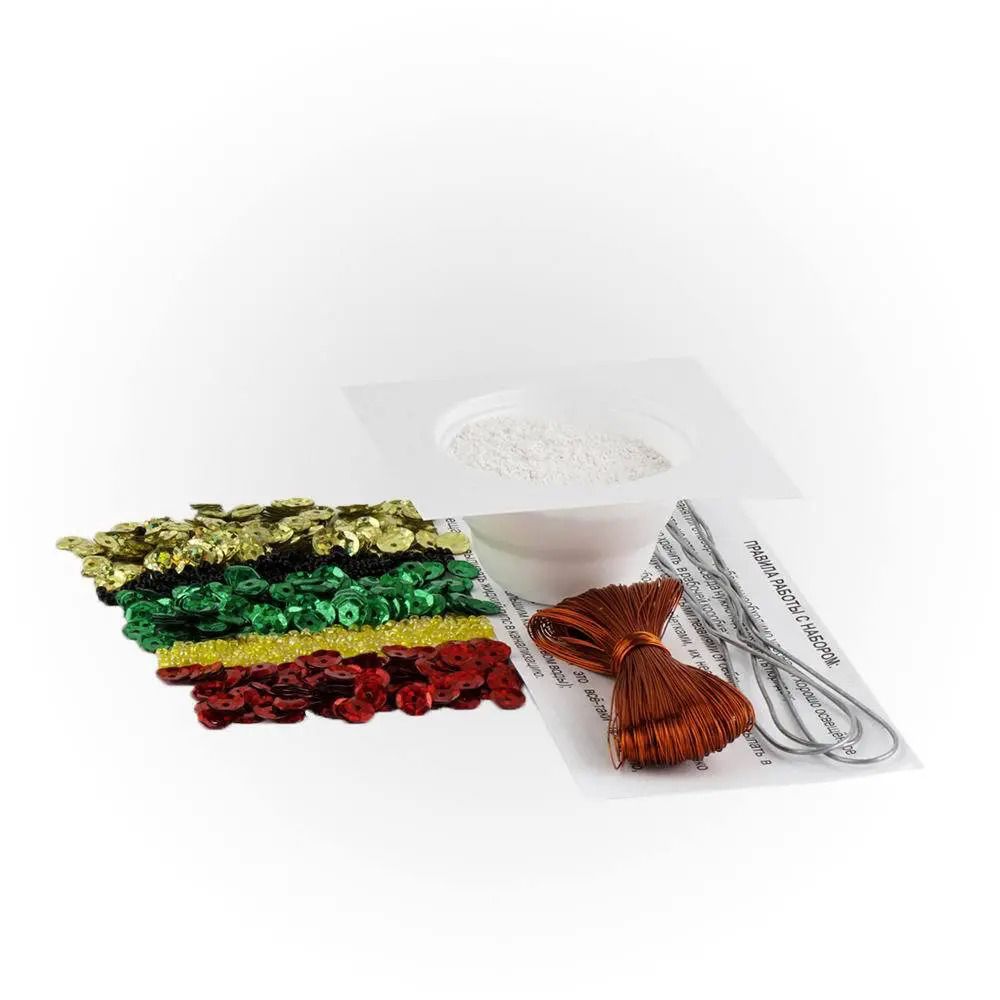 Бисер, стеклярус, акриловые бусины(для аленького цветочка), пайетки, пряжа, проволока, гипс, полистирольная форма для заливки гипса, подробная инструкция.