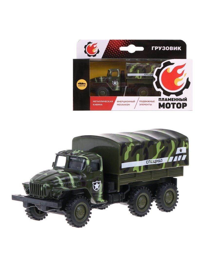 Уменьшенная версия военной машины-грузовика отличается тщательной проработкой деталей. Металлическая кабина высоко детализирована: внутри нее можно разглядеть сиденья для водителя и пассажира, а также руль. В игрушке есть инерционный механизм движения – pull back. Чтобы отправить машину в самостоятельное путешествие, нужно сперва откатить ее назад, на небольшое расстояние, а затем отпустить. «Тент» кузова можно снимать.