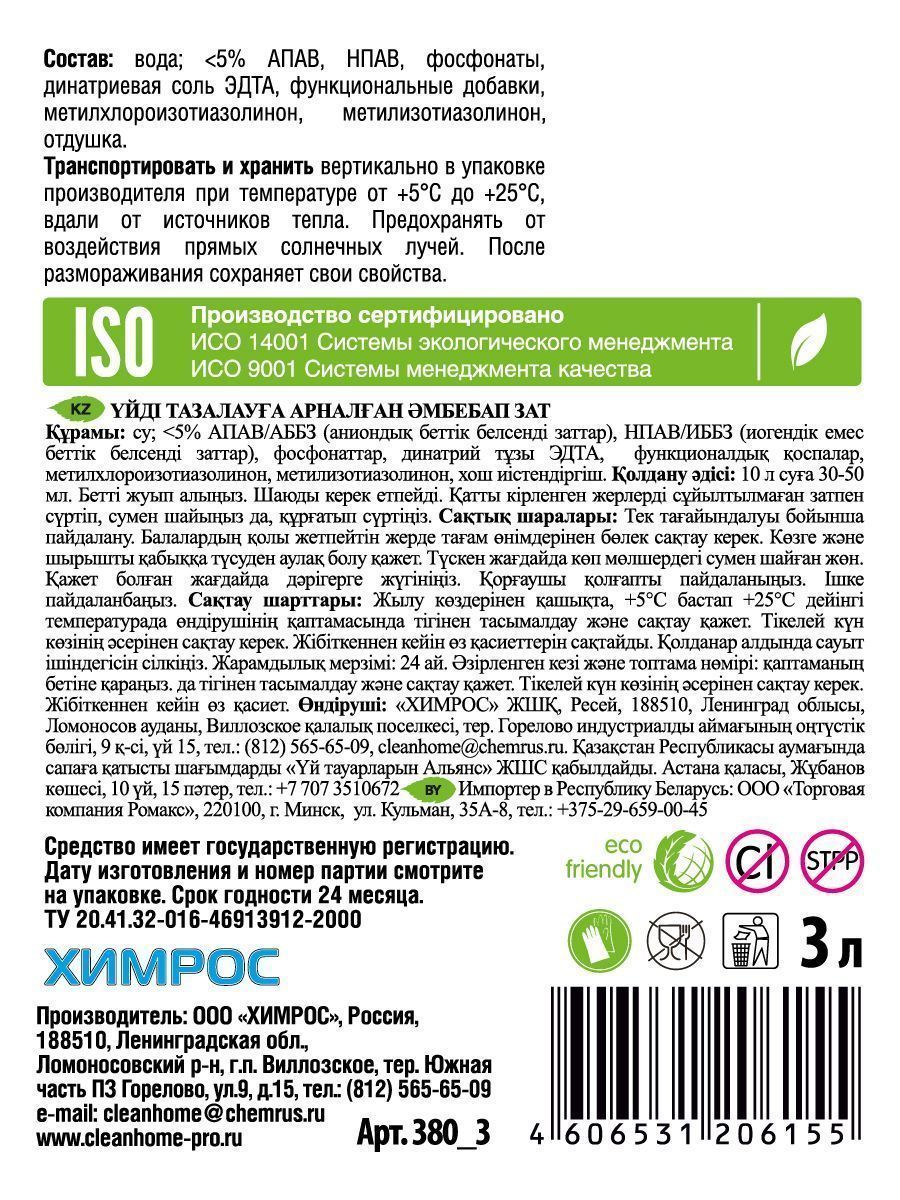 Универсальное средство поможет справиться с любыми загрязнениями на кухне и в доме. Идеально очистит любые поверхности, которые можно мыть: плитку, кафель, пластик, линолеум. Подходит для мытья холодильников и поверхностей бытовой техники. Средство содержит антистатик. Устраняет неприятные запахи. Не оставляет разводов.