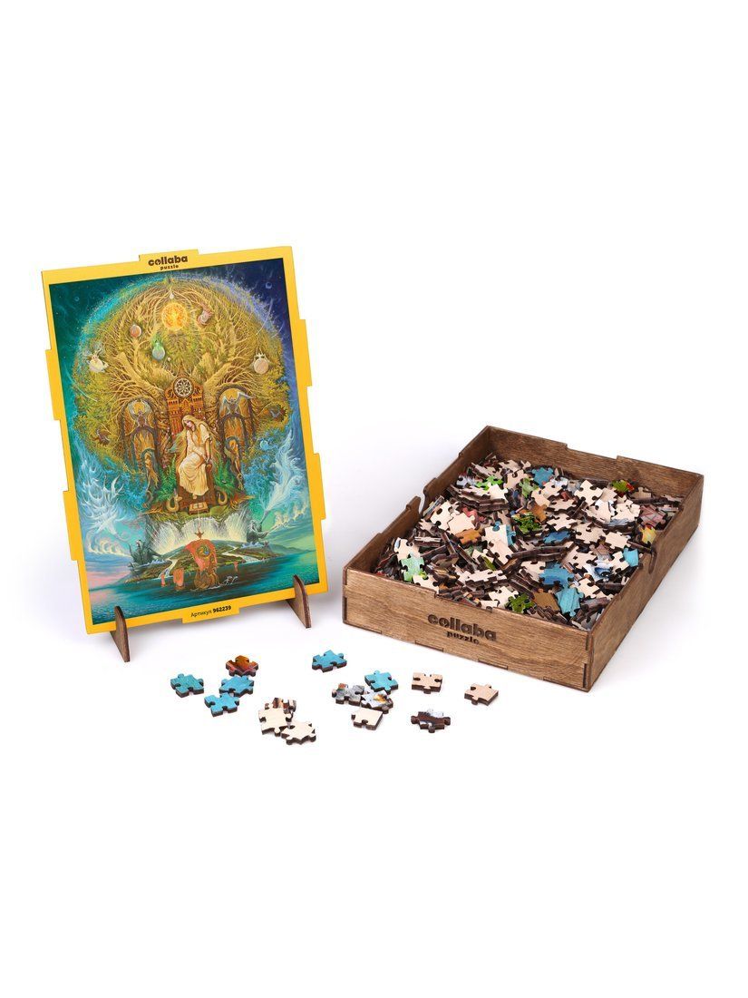 Деревянный пазл для взрослых, детей и подростков "Вдохновение" обязательно понравится всем, кто любит изобразительное искусство, а еще интересуется мифологией и фэнтези! Картины художника-славяниста Александра Угланова завораживают своей многослойностью, яркостью красок и волшебными мирами. У этого пазла из дерева классический вариант замка и классическая форма деталей. Собирать такой пазл сложнее, чем фигурный, но тем интересней и увлекательней становится сам процесс сборки, а приятный запах дерева добавляет в него особое ощущение теплоты и уюта. Зато если в процессе сборки правильно подобрать нужную деталь, она легко и без лишних усилий встает на свое место. Тонкие линии реза и классический контур деталей деревянного пазла визуально сохраняют целостность картины и не разбивают ее на отдельные кусочки. Благодаря этому можно полностью сосредоточиться на самой картине, почувствовать ее энергию и цветовую гармонию, собрать ее из разных красок, мазков и оттенков в единое целое! Репродукция работы напечатана прямо на дереве, а не на бумаге. Если присмотреться к деталям пазла, то можно увидеть фактуру дерева, при этом поверхность готовой картины после сборки будет гладкой и ровной, в отличие от пазлов, вырубленных из картона. Пазл упакован в стильную коробку-шкатулку из фанеры. Изображение для сборки нанесено на обратную сторону крышки коробки. Также в наборе есть специальная сборная подставка, на которую можно установить крышку с изображением для удобства сборки. Собранный пазл, при желании, можно склеить, поместить в рамку и повесить на стену (основа для склеивания и рамка не входят в комплект), и он станет украшением интерьера. Деревянный пазл в подарочной упаковке станет универсальным подарком на любой праздник! Количество деталей: 532. Размер пазла в собранном виде: 31х42 см. Сложность сборки: 5 из 10. Художник: Александр Угланов.