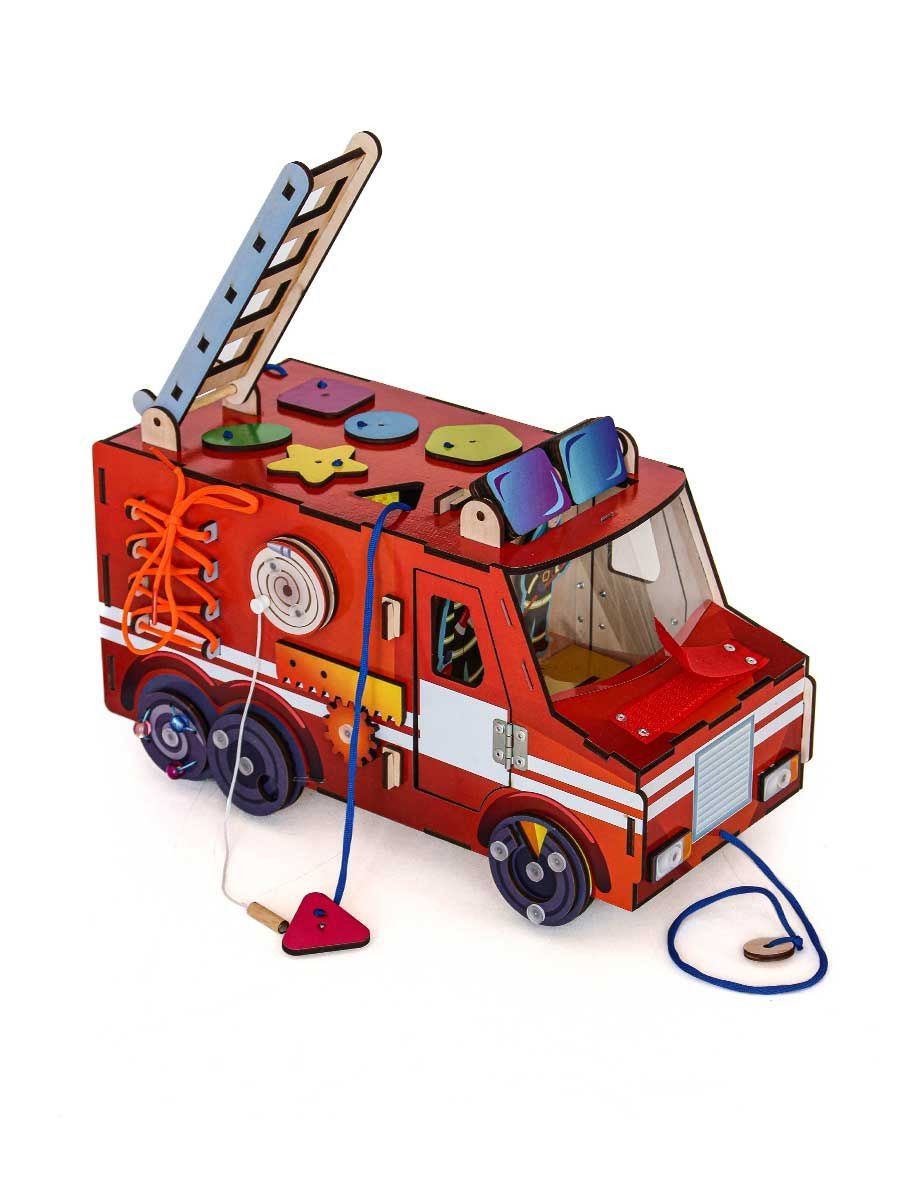 Экологичный бизиборд «Пожарная машина» из дерева – это игрушка для развития логики, интеллекта, памяти. На разных сторонах машины расположены тематические изображения, закрепленные и подвижные детали. На этом компактном бизиборде удачно расположены 28 элементов, которые способствуют развитию психомоторных функций детей.