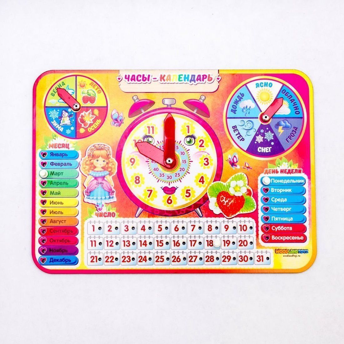 Часы-календарь – это многофункциональная развивающая игрушка для знакомства малыша с временем. Игрушка представляет собой красочный деревянный планшет с подвижными стрелками и съёмными пластиковыми деталями-указателями. Изображение разделено на несколько тематических зон, которые знакомят с временем, датой, месяцами, днями недели, временем года, погодными условиями. Игра с планшетом предполагает выбор в каждой зоне определенного пункта, фиксирование его с помощью стрелок или пластикового указателя. Игры и занятия с игрушкой «Часы-календарь» помогут ребенку в развитии мышления, памяти, воображения, зрительного и тактильного восприятия, в формировании любознательности, терпения, усидчивости и познавательной активности. Часы-календарь станут любимой игрушкой ребенка, а также незаменимым пособием в получении важных знаний в категории время. Материал изготовления: дерево. Рекомендованный возраст: 3 года +