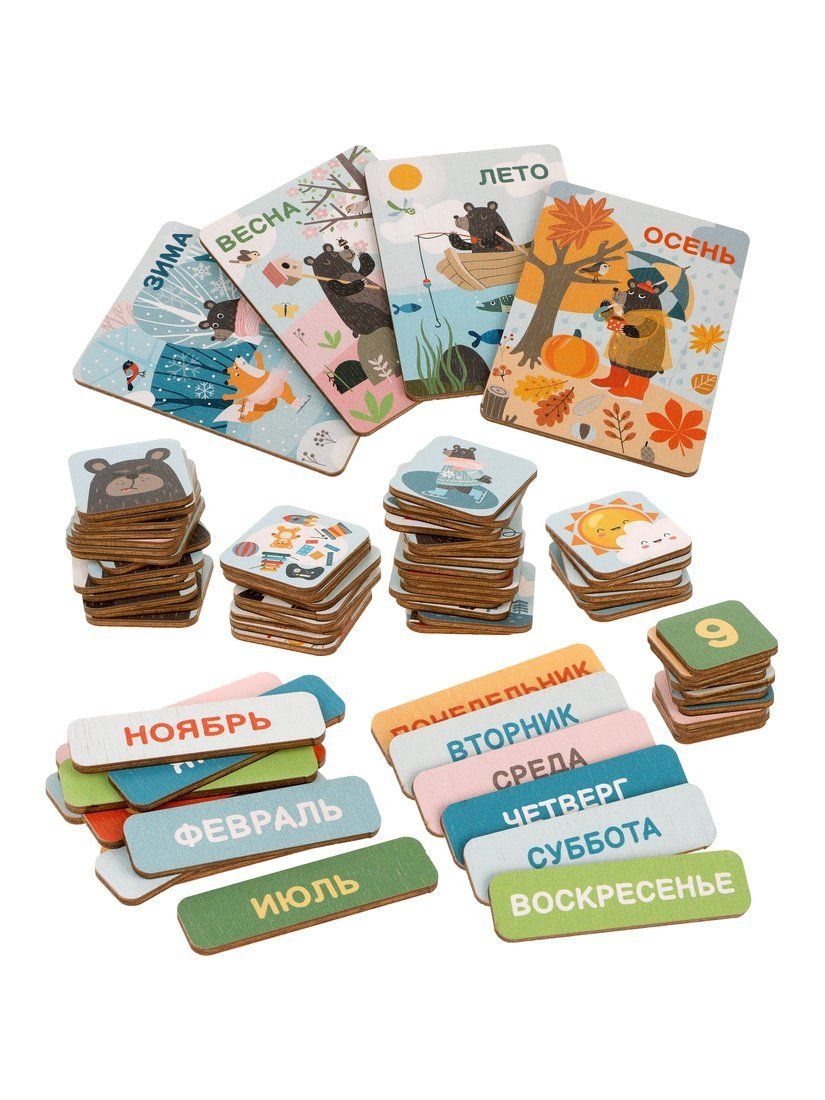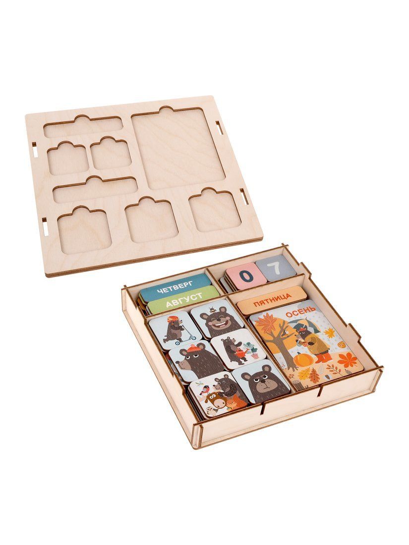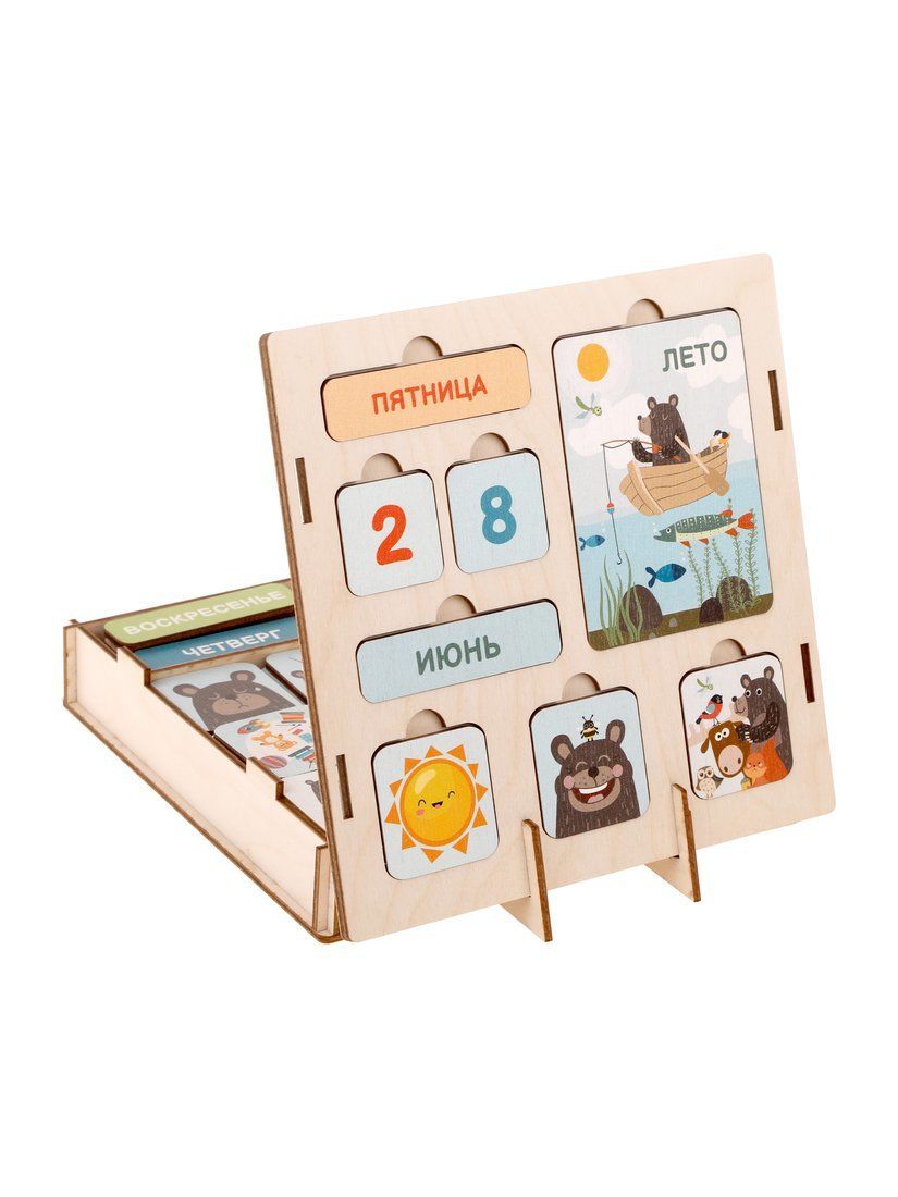 Этот веселый деревянный календарь с медведями познакомит ребенка с такими важными понятиями, как времена года, месяцы, числа и дни недели. Ребенок не только научится самостоятельно выставлять дату, но и сможет персонализировать день вкладышами с изображением соответствующей погоды и настроения, а также планировать дела, которыми собирается заниматься.