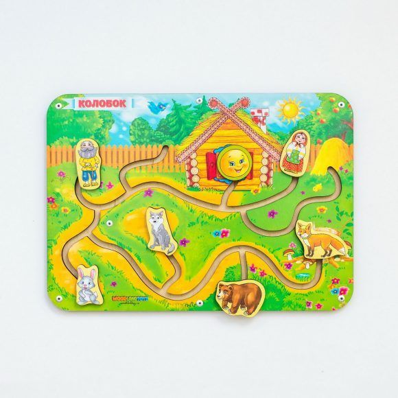 Лабиринт – познавательная развивающая игрушка для любознательных малышей. Лабиринт «Колобок» создан по мотивам одноименной русской народной сказки. Задача ребенка для каждого героя найти свое место, определить правильный путь и двигать фигурки по дорожкам до нужного места. Игровые действия с Лабиринтом развивают логическое мышление, память, воображение, зрительное и тактильное восприятие, знакомят с предметами и объектами окружающего мира, учат ориентироваться в пространстве. Процесс игры с Лабиринтом занимает ребенка на продолжительное время и дарит массу положительных эмоций.