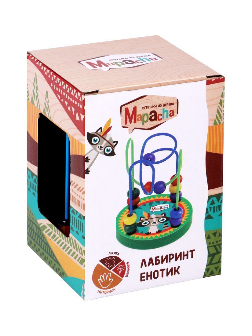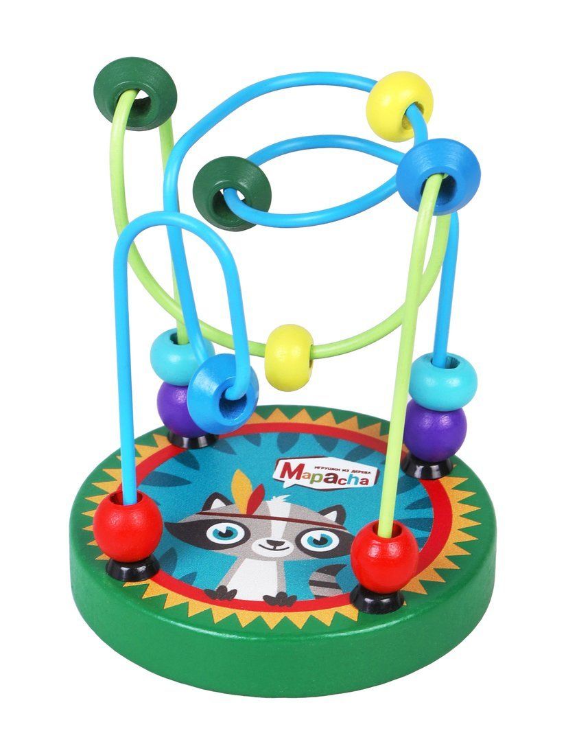 Игрушка-лабиринт состоит из деревянного основания с изображением енота и прикреплённых к нему металлических дуг с разноцветными деревянными бусинками. Задача малыша – провести все бусины по извилистым дорожкам-дугам!