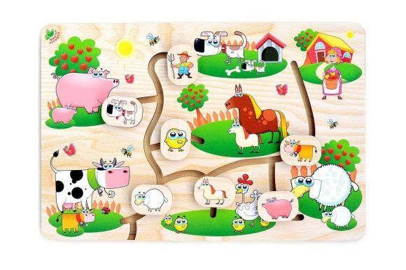 Игра представляет собой картинку с вырезанными частями, движущимися по пазам. Суть игры состоит в том, чтобы каждое «заблудившееся» животное вернуть в его «семью».Вначале нужно показать ребенку, как играть с этой игрушкой. Для этого сами переместите какое - нибудь животное в нужное место по лабиринту. Произносите вслух названия животных на вкладышах – это позволит ребенку запомнить их и различать между собой.