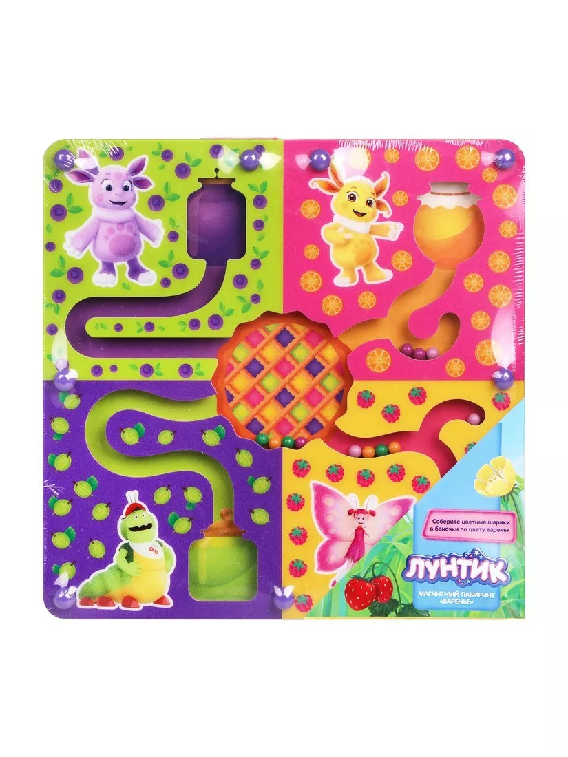 Магнитный лабиринт «Варенье» поможет ребенку потренировать мелкую моторику и координацию движений вместе с героями любимого мультфильма. Задача игры – рассортировать цветные шарики в «баночки» по цвету варенья. Шариками легко управлять при помощи магнитного стилуса, входящего в комплект. Стилус имеет удобный для детской руки размер и снабжен текстильной веревочкой.