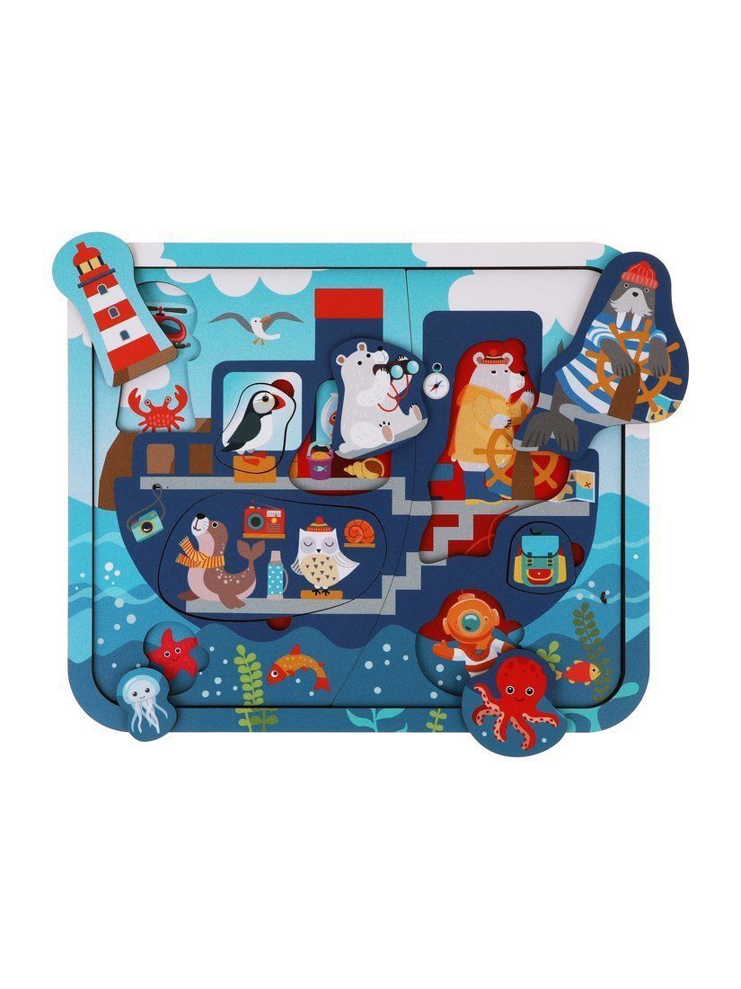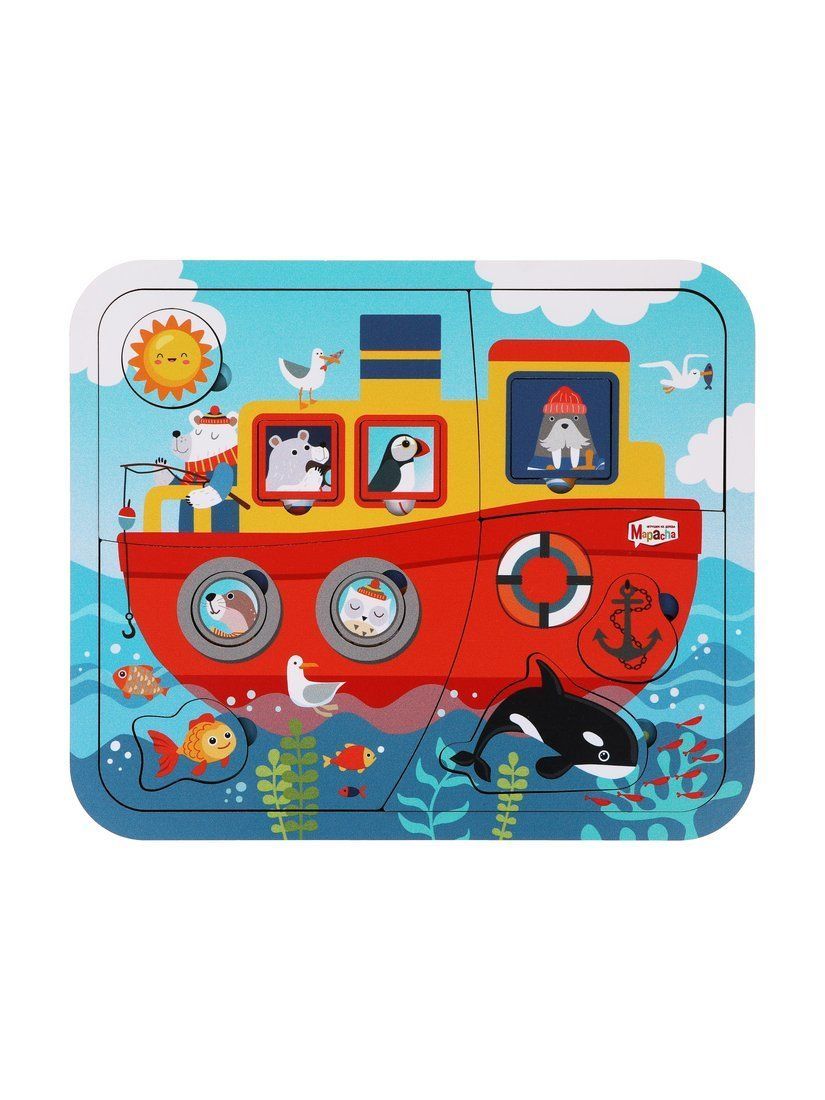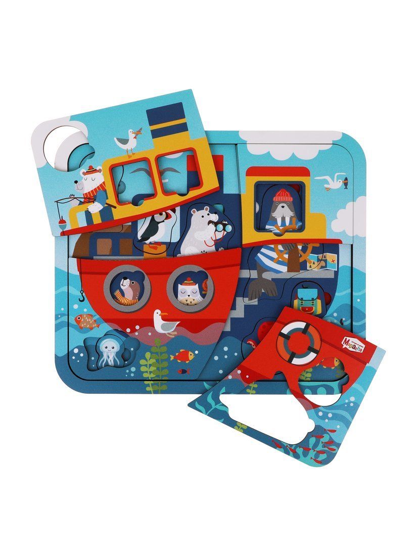 Деревянный многослойный пазл «Корабль» создан специально для малышей. Пазл состоит из 23-х деталей – вкладышей, расположенных в несколько слоев. На каждом слое изображены милые персонажи – животные, птицы, рыбы и другие подводные обитатели, а также предметы в морской тематике. Около вкладышей есть удобные выемки для маленьких детских пальчиков, поэтому ребенку не составит особого труда достать ту или иную деталь.