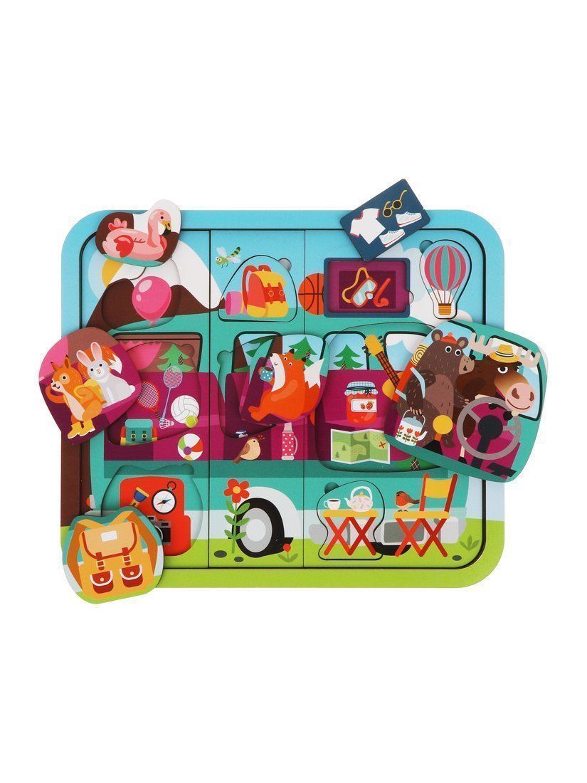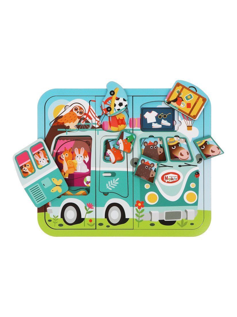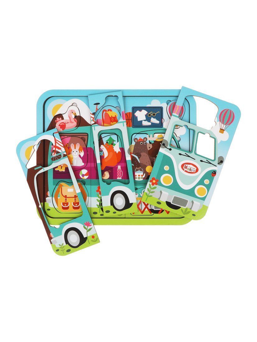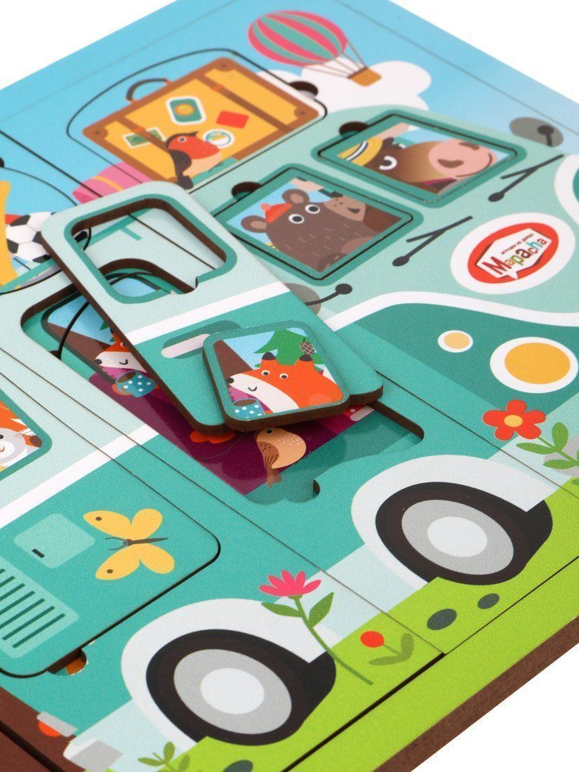 Деревянный многослойный пазл «Путешествие на автобусе» создан специально для малышей. Пазл состоит из 23-х деталей, 3-х слоев. На первом слое изображены забавные зверята, выглядывающие из окошек автобуса. На втором слое – салон автобуса изнутри вместе с животными (медведем, лосем, лисичкой, зайцем и белкой) и вещами, которые они взяли с собой в путешествие. Третий слой – это основание пазла.