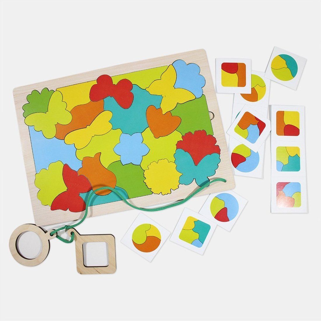 Деревянная панель с извлекаемыми деталями. Круглая и квадратная лупа, картонные карточки с рисунками.