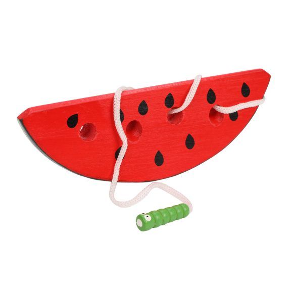 Шнуровка «Арбузик» - интересная и захватывающая игрушка для малышей, которая оказывает благоприятное влияние на развитие внимания и мелкой моторики детских пальчиков. Цель игры - прошнуровать круглые отверстия в арбузе, используя текстильный шнурочек с забавным червячком на конце.