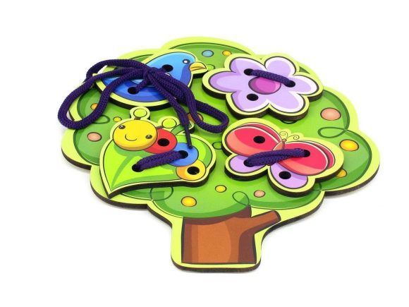 Шнуровка «Дерево» представляет собой изделие с уже завязанным шнурком. Вначале нужно показать ребенку, как играть с этой игрушкой. Для этого сами расшнуруйте предметы и снова зашнуруйте их, повторив действие несколько раз. Комментируйте свои действия – это поможет ребенку запомнить их последовательность и позволит быстрее освоить навык завязывания шнурков.