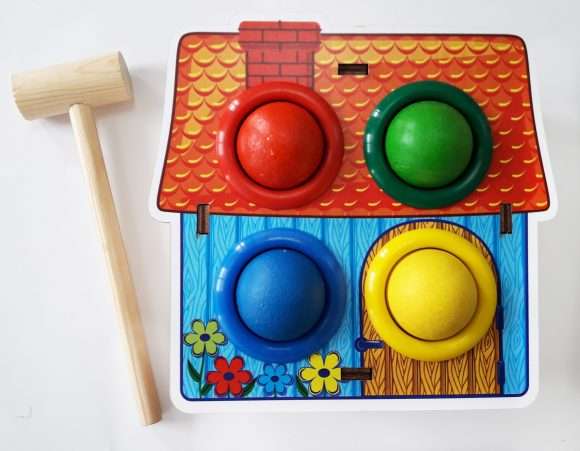 Цветная стучалка «Домик» - это игрушка, направленная на развитие ловкости, меткости, сноровки и координации движений. Игровое поле оснащено 4-мя круглыми отверстиями, в которые малышу предстоит забить при помощи молотка разноцветные шарики. Размер игрушки (ДхШхВ) составляет 14х13х6 см, длина молоточка: 15 см. Изделие изготовлено из древесины и пластика. Рекомендованный возраст: 3 года +