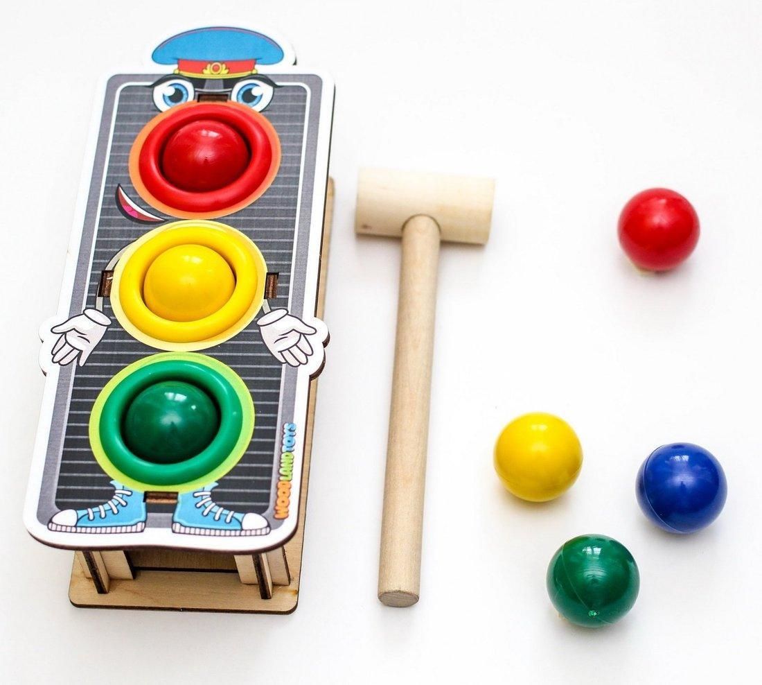 Стучалка – развивающая игрушка для любознательных непосед. Игрушка представляет собой прямоугольный объёмный деревянный корпус с цветными пластиковыми отверстиями-сортировщиками, пластиковые шарики и деревянный молоточек. Задача ребенка – раскладывать в отверстия по цвету шарики, воздействовать на них рукой или молоточком и ловить, когда они выкатываются из специального бокового отверстия. Этот занимательный процесс приносит ребенку массу положительных эмоций и развивает любознательность. Игры со Стучалкой развивают логическое, образное и предметно-действенное мышление, память, восприятие цвета и звука, тренируют мелкую моторику и координацию движения. Стучалка – удивительная игрушка, которая очень понравится любому ребенку и поможет с пользой провести время.