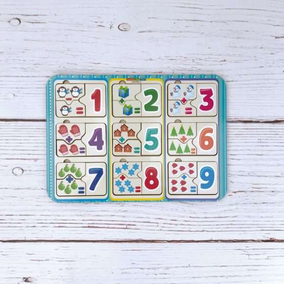 Набор состоит из игрового поля и карточек-вкладышей с примерами на сложение и вычитание. На карточках изображены различные предметы, соответствующие новогодней тематике (снеговики, снежинки, варежки и т.д.).
