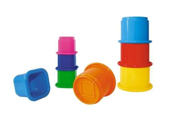 Занимательная пирамидка - игрушка для самых маленьких, она состоит из восьми элементов двух типов: цилиндрических и кубических. Каждый элемент окрашен в яркий цвет. Из деталей можно собрать высокую башенку или использовать их как формочки для песка.