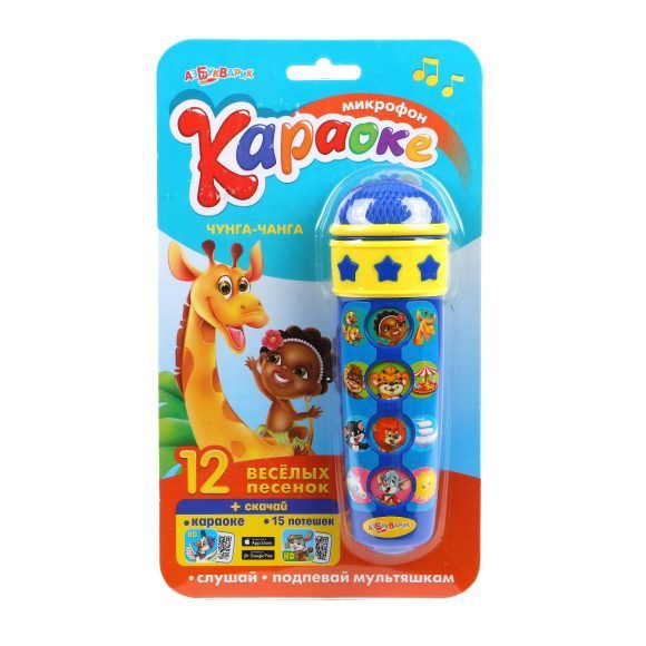 Новые оригинальные микрофоны-караоке для будущих звёзд сцены! В каждом микрофоне – 14 популярных песенок В. Шаинского, Е. Крылатова, М. Танича и других известных композиторов: "Чунга-Чанга", "Песенка о жирафе", "Танец утят", "Какой чудесный день!", "Песенка паровозика", "Когда мои друзья со мной", "Песенка друзей", "Белые кораблики", "Песня Львёнка и Черепахи", "Облака", "Здравствуй, детство!", "По дороге с облаками", "Весёлая карусель", "Песенка о лете". Нажимай на кнопочки-звёздочки - пой с Крошкой Енотом, Мамонтенком, Антошкой и другими мультяшками.