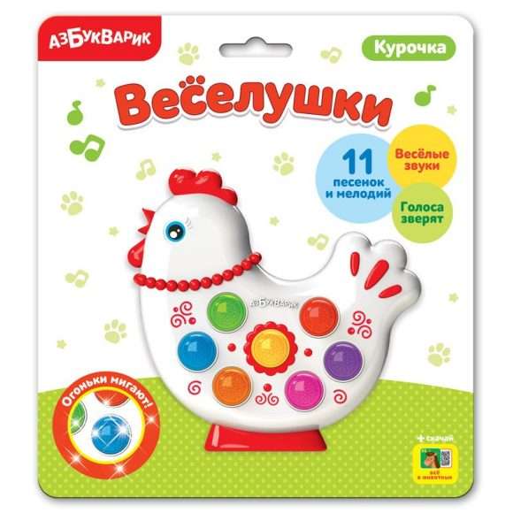 Яркая курочка из серии музыкальных игрушек Веселушки привлечёт внимание малышей весёлыми звуками, мигающими огоньками, любимыми песенками и мелодиями ("Курочка Ряба", "Ладушки", "Кто цыплёнка пожалеет?", "Солнышко-колоколнышко", "Мама-курица", "Гули-гуленьки", "Барыня", "Валенки", "Антошка", "Ах, вы, сени, мои сени", "Чижик-пыжик")!