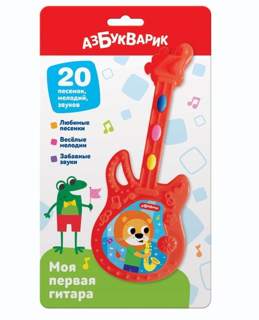 Эта игрушечная гитара станет отличным подарком для маленьких музыкантов! В ней нет настоящих струн, но зато есть три музыкальные кнопочки! Нажимая на них, малыш сможет послушать 5 детских хитов («Пляшут весело детишки», «Калинка», «Чижик-пыжик», «Бум-Бум», «Что такое праздник?»), 3 танцевальные мелодии и множество забавных звуков. Яркий цвет гитары, стильный дизайн и наклейка с веселым персонажем привлекут внимание ребенка! Малыш захочет играть на этой гитаре снова и снова! «Моя первая гитара» пригодится не только для развлечения! Такая игрушка поможет в развитии музыкального слуха, мелкой моторики и координации движений.