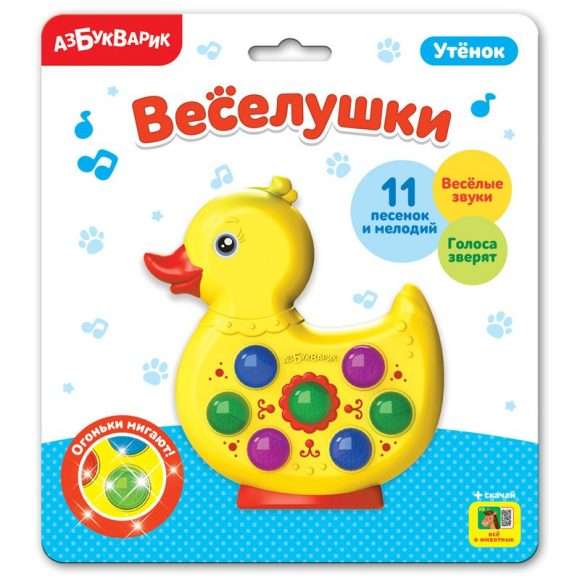 Яркая уточка из серии музыкальных ирушек Веселушки привлечёт внимание малышей весёлыми звуками, мигающими огоньками, любимыми песенками и мелодиями ("Бояка", "Водичка", "Два весёлых гуся", "Пирожки", "Гуси-гуси", "Калинка", "Танец утят", "Я на горку шла", "Яблочко", "Как у наших у ворот", "Каравай")!