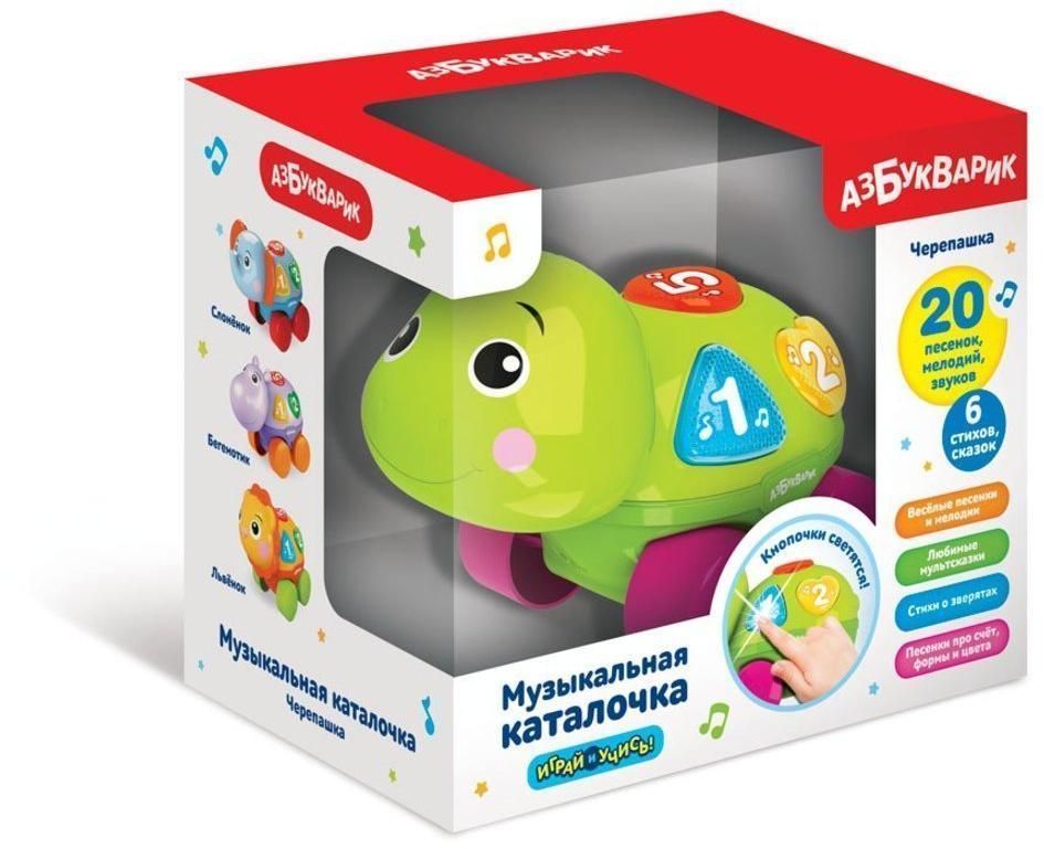Малыш будет в восторге от своего нового друга на колесиках – черепашки! На спине у неё – разноцветные фигурные кнопочки с огоньками. Нажимая на кнопки, ребенок послушает любимые сказки со множеством забавных звуков(«Мама для Мамонтенка», «Марусина карусель»), обучающие песенки про счет, формы и цвета, хиты из мультиков, танцевальные мелодии и стихи о зверятах. И конечно, под музыку так весело катать черепашку и бегать за ним! Игрушки-каталочки побуждают малыша активно двигаться, развивают познавательные и музыкальные способности.