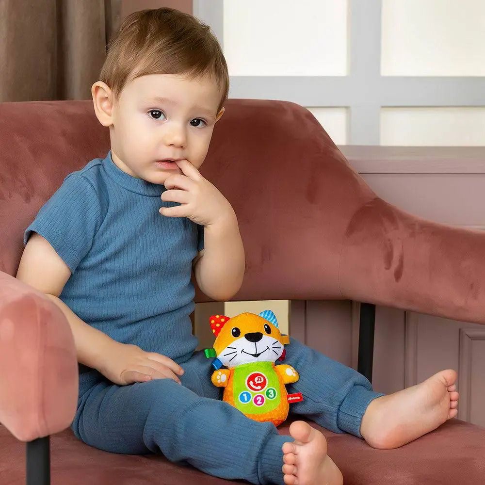 Необычный телефончик для самых маленьких – в виде мягкой музыкальной игрушки. Нажимая на телефонную трубку на животике котика, малыш сможет позвонить ему, а котик ему обязательно ответит и поговорит, и даже споет веселые песенки. При нажатии на носик котик будет забавно пищать. Всего в игрушке 15 песенок, мелодий и звуков.