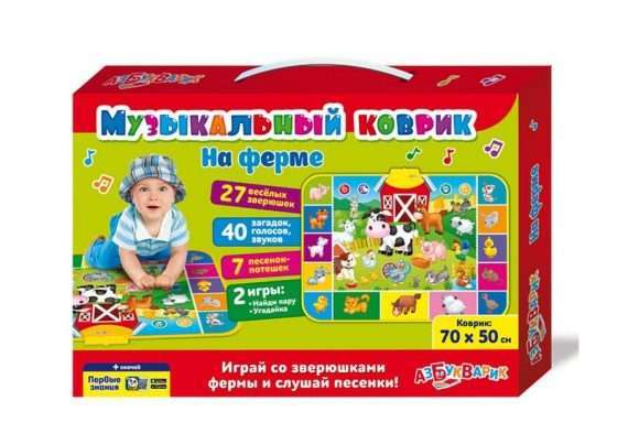 Новый музыкальный коврик разработан специально для малышей. Он большой, яркий, обучающий и интерактивный! 27 весёлых зверюшек, 40 загадок и звуков, 7 потешек ("Петушок", "Идёт коза рогатая", "Калинка", "Пошёл котик на торжок", "Топ-топ, топотушки", "Два весёлых гуся" и "Антошка"), 2 увлекательные игры ("Найди пару" и "Угадайка") – всё это не оставит детей равнодушными! Нажимай на картинки – играй со зверюшками фермы и узнавай о них много интересного!