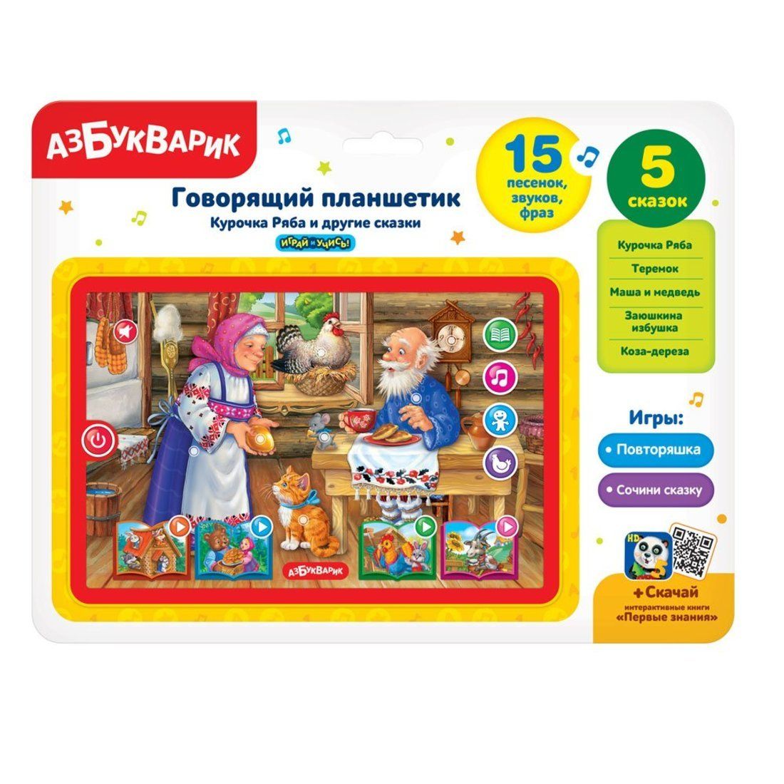 Планшетик «Курочка Ряба и другие сказки» – это 5 песенок, 5 сказок («Курочка Ряба», «Теремок», «Заюшкина избушка», «Маша и медведь», «Коза-дереза»), игры «Повторяшка» и «Сочини сказку».