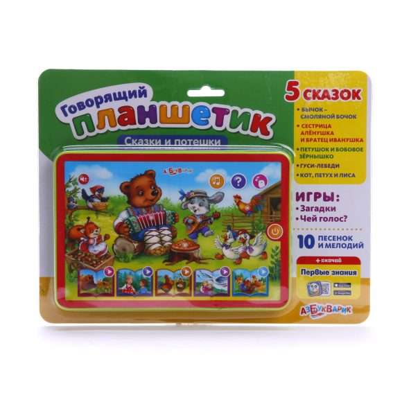 10 песенок и мелодий, 5 сказок («Бычок – смоляной бочок», «Сестрица Алёнушка и братец Иванушка», «Гуси-Лебеди», «Петушок и бобовое зёрнышко», «Кот, петух и лиса»), игры «Чей голос?» и «Загадки» порадуют малышей в планшетике «Сказки и потешки».