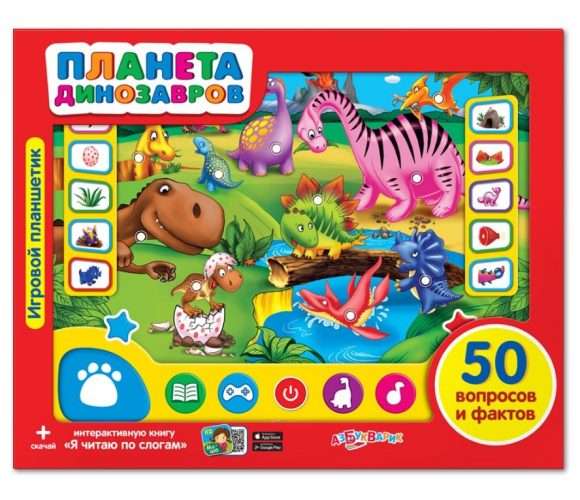 Планшетик «Планета динозавров» от торговой марки «Азбукварик» - весёлая электронная игрушка, которая поспособствует психоэмоциональному развитию ребёнка. Нажимая на картинки, малыш познакомится поближе с забавными динозавриками. А при выборе режима «Удивительные факты» узнает много нового об этих древних и загадочных животных. Для закрепления полученных знаний предусмотрены игры «Диновикторина» и «Приключения динозавров». С помощью QR-кода на упаковке можно бесплатно скачать на телефон или планшет интерактивную книгу «Я читаю по слогам».