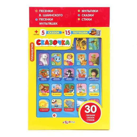 Этот планшетик надолго займёт внимание малыша! Ведь в нём есть и добрые мультики, и весёлые песенки (В. Шаинского и др. композиторов), и любимые сказки, и стихи известных поэтов. Малыш сможет спеть с Антошкой и Мамонтёнком, послушать истории про Чучело-Мяучело, Волка и Зайца из «Ну, погоди!», выучить стихи А. Барто, В. Степанова, Е. Каргановой и др.