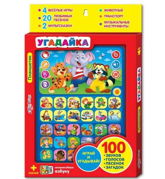 Этот интерактивный планшетик подарит детям много приятных моментов. Знаешь, какой голос у белочки и зайчика? Как звучит скрипка? Как гудит самолёт? А кто поёт песенку «Чунга-чанга»? Играя в угадайку, любознательный малыш познакомится с животными, транспортом и музыкальными инструментами, послушает мультсказки ("Мама для мамонтёнка" и "Трям! Здравствуйте") и 20 песенок любимых героев. Всего в планшетике собрано 4 игры: «Чей голос?», «Угадай звук!», «Угадай песенку», «Весёлые загадки».