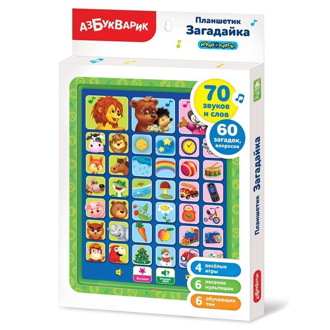 Ваш малыш любит отгадывать загадки? Тогда Планшетик Загадайка – для него! В нем собрано 60 загадок по шести познавательным темам: животные фермы, обитатели зоопарка, животные леса, чудеса природы, овощи и фрукты, игрушки. А еще ребенку обязательно понравится нажимать на яркие картинки, угадывать звуки и слушать песенки мультяшек: Крошки Енота, Львёнка, Ёжика и Медвежонка! Хочешь поиграть в прятки со зверятами на смартфоне или планшете? Скачай бесплатно интерактивное приложение от «Азбукварика»! QR-код для скачивания – внутри упаковки.