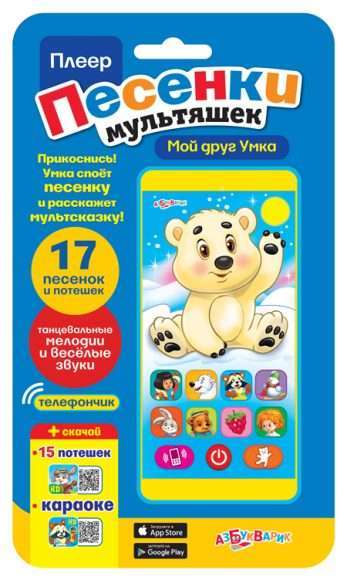 Интерактивный плеер-смартфончик с любимыми мультяшками! Прикоснись к Умке, и он расскажет сказку и споёт песенки: «Когда мои друзья со мной», «Песенка Умки», «Пусть бегут неуклюже», «Колыбельная медведицы», «Почему медведь зимой спит», «Улыбка», «Песенка про кузнечика», «Кабы не было зимы…», «Расскажи, Снегурочка». А ещё в весёлом телефончике малыша ждут танцевальные мелодии и забавные звуки.