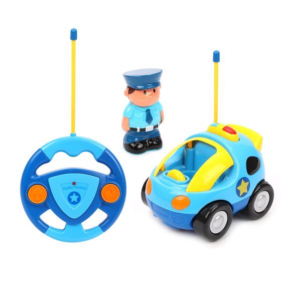 Малыш очень быстро научится управлять этим полицейским автомобилем самостоятельно, ведь на пульте управления игрушки всего две кнопки! Зато как быстро он умеет ездить! Чтобы гонка по воображаемой трассе стала ещё интереснее, малыш может нажать на кнопки на багажнике или капоте – заиграет весёлая музыка и малыш услышит забавные звуки. Эта увлекательная игра будет сопровождаться ещё и световыми эффектами, и, конечно же, яркими эмоциями ребёнка! Машинка может ездить вперёд и делать разворот назад. Пульт управления выполнен в форме красочного руля, который очень похож на настоящий! В комплект входит фигурка полицейского. Для того, чтобы услышать звук заводящейся машины, нужно нажать на руль. Если нажать на полицейского – послышатся забавные звуки, а при нажатии на кнопку багажника заиграет весёлая музыка. Игрушка работает от 5-ти батареек типа АА на 1,5 V. Элементы питания в комплект не входят! Изделие изготовлено из пластмассы. Размер автомобиля (ДхШхВ): 13х9х10 см, диаметр пульта: 12 см, высота фигурки полицейского: 7,5 см. Рекомендованный возраст: 18 мес. +