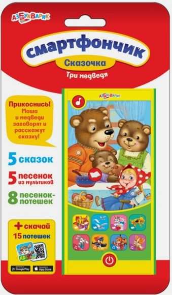 На новом смартфончике записано 5 любимых сказок, 8 весёлых песенок-потешек и 5 хорошо знакомых всем малышам песенок из мультфильмов! Малышу наверняка понравится нажимать на яркие кнопочки, петь и веселиться с любимыми героями. На телефончике представлены: