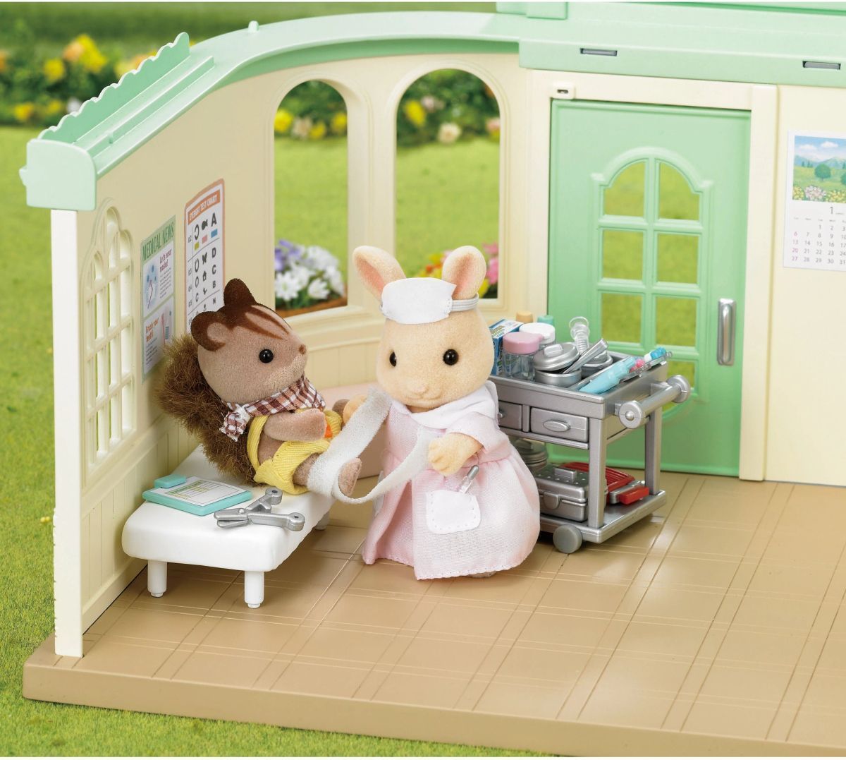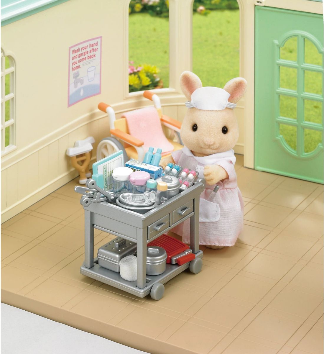 Маленькая медсестра уже собрала свою аптечку и отправляется к пациентам. Помогите кролику провести осмотр, привезти пациентов на процедуры в больничном кресле, сделать им перевязки, дать лекарства. Обязательно померяйте температуру больному, проведите анализы и уложите в палату. Если нужно – наложите гипс зверюшке или выдайте костыли, чтобы она могла свободно передвигаться. • Больничное кресло оснащено колесиками и удобными ручками, в нем можно перевозить маленькие фигурки Sylvanian Families. • Столик для лекарств и больничных инструментов имеет небольшие колесика, легко передвигается.