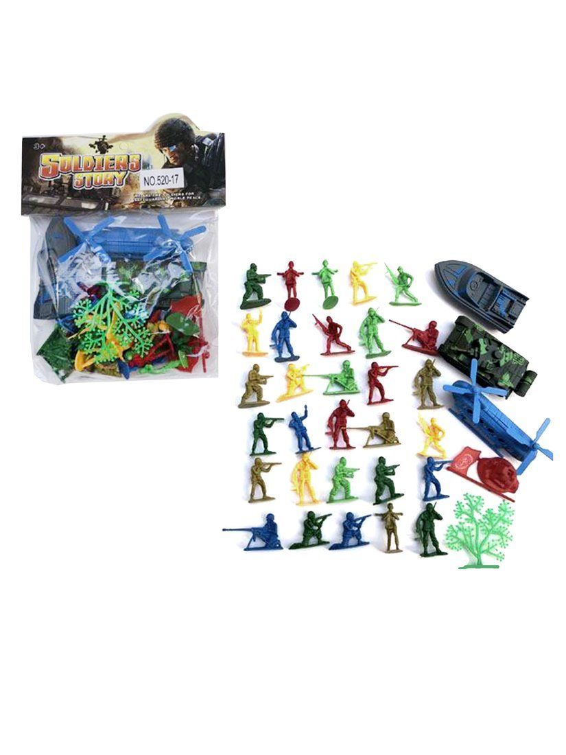 В комплекте прилагаются 36 игрушечных предметов, среди которых: 30 фигурок солдатиков, флаг со стойкой, лодка, танк, вертолет, дерево.