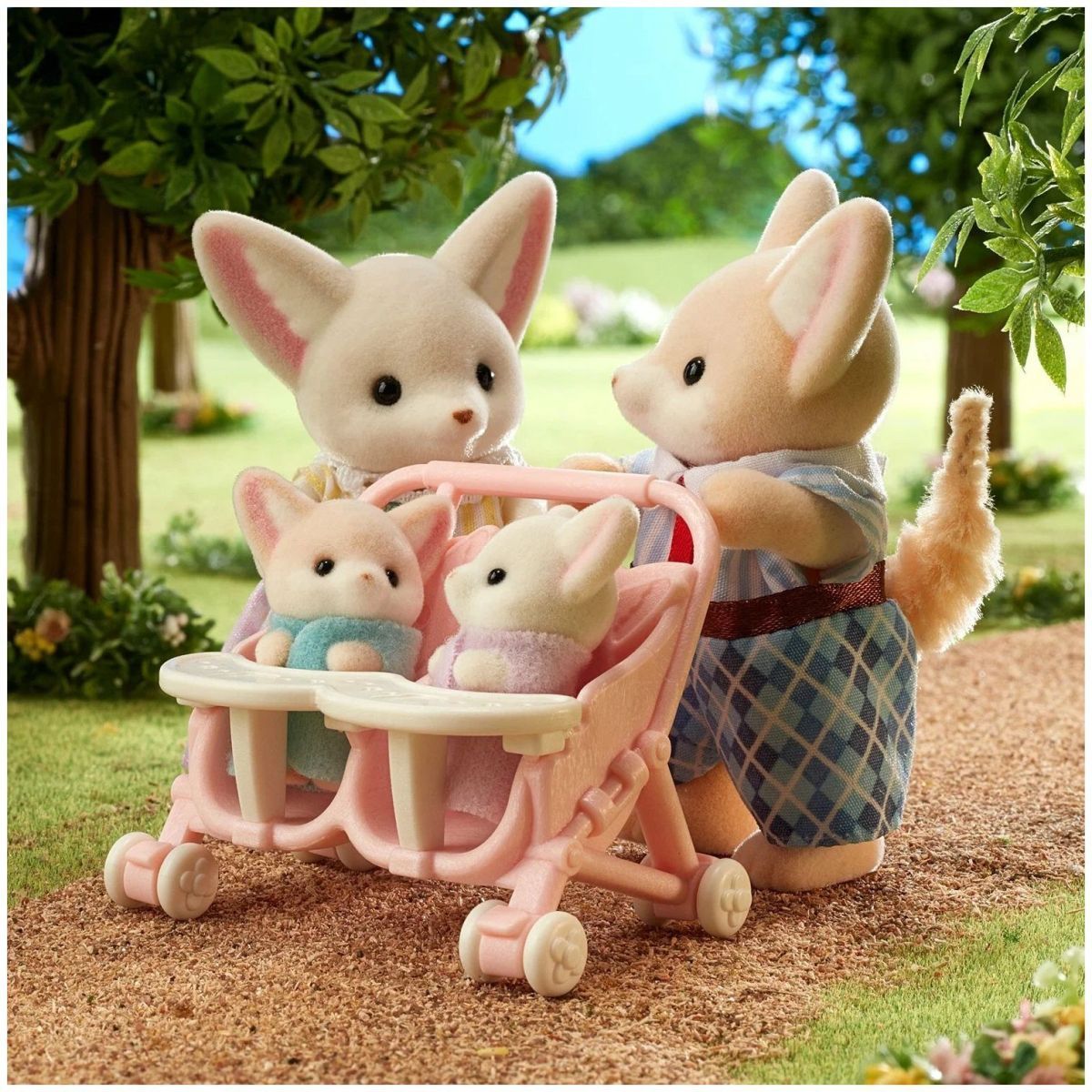 В комплекте: • Фигурка папы-Лиса фенек Рональда. • Фигурка мамы-Лисы фенек Шэрон. • Фигурка малыша-Лисички Элли в фиолетовом наряде. • Фигурка малыша-Лисички Кайи в мятно-зеленом наряде. • Коляска для близнецов.
