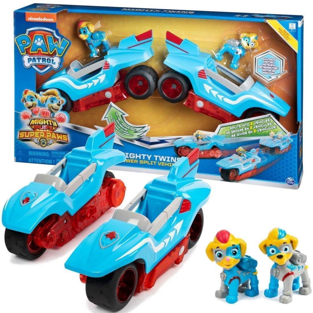 Мега-машинка 2 в 1: В наборе две фигурки щенков-близнецов и инерционная машинка. При запуске машинка разделяется на два самостоятельных мотоцикла.