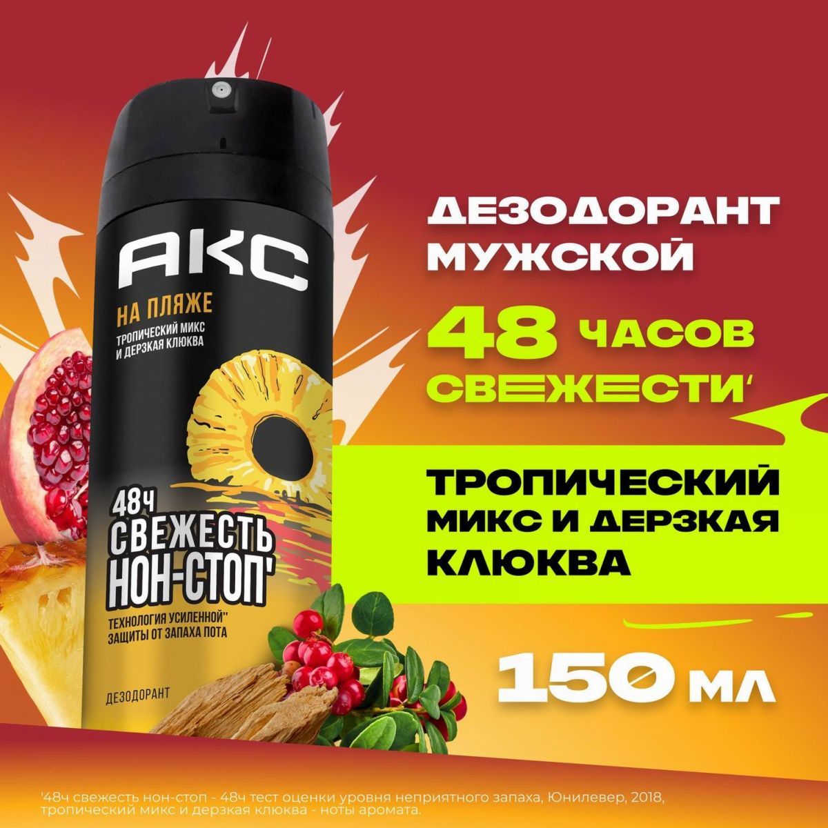 Дезодорант мужской спрей Акс «На пляже» - это эффективная уходовая новинка, созданная для крутых парней, которым нужна полная уверенность в своем образе. Парфюмированный дезодорант мужской обеспечивает надёжную защиту от запаха пота на протяжении 48 часов'. Дезодорант для мужчин содержит активный компонент против бактерий. Акс дезодорант мужской аэрозольный с топовым* ароматом разработан на основе ультрасильной'' антибактериальной технологии против запаха пота. Дезодорант Акс мужской «На пляже» обеспечивает желанную свежесть нон-стоп и эффективный уход коже подмышек.