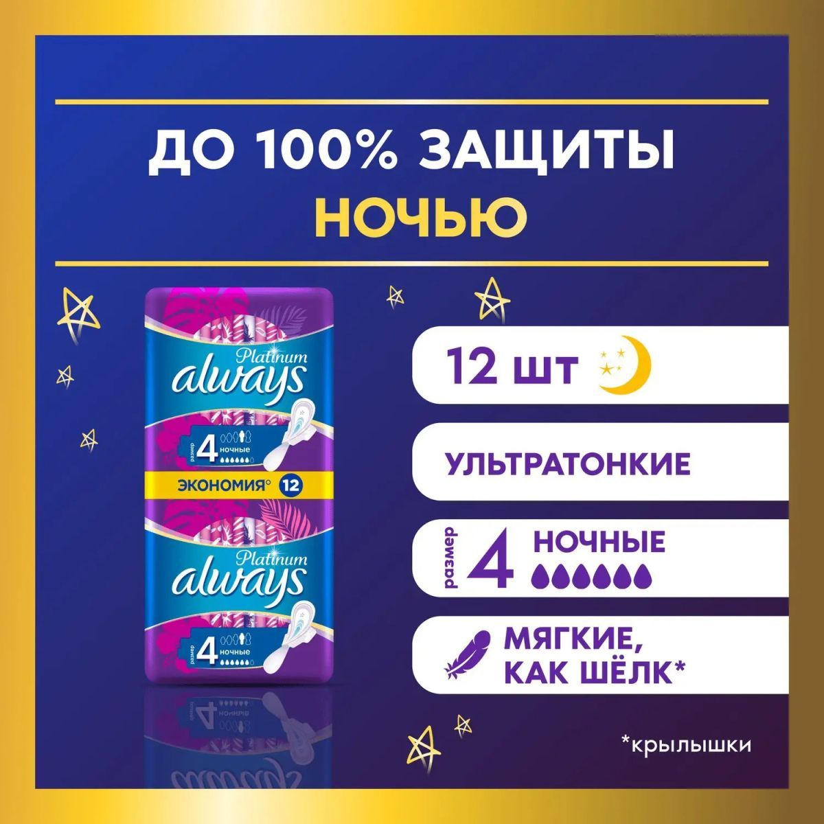 Always Platinum Ночные (Размер 4) с крылышками рекомендованы для ночного использования или для дневного использования при обильных выделениях.