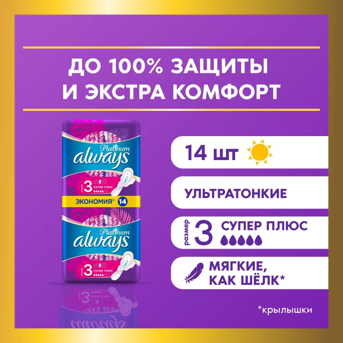 Гигиенические прокладки Always Platinum обеспечивают лучшее сочетание комфорта и защиты среди прокладок Always.  Always Platinum более комфортны (по сравнению с Always Ultra) благодаря тысячам микроподушечек и новым, мягким как шелк крылышкам. Они также обеспечивают лучшую защиту (по сравнению с Always Ultra) благодаря защитным боковым барьерам и ультравпитывающему внутреннему слою, который запирает влагу внутри. Always Platinum «Супер» Плюс (Размер 3) с крылышками рекомендованы для дневного использования при умеренных выделениях.