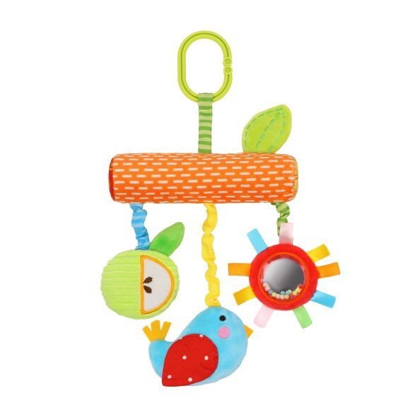 Развивающие элементы подвески: внутри крылышек птички и внутри листика -- потайная шуршалка, птичка-пищалка, яблочко с шариками, погремушка-зеркальце.